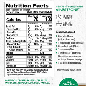 New York Corner Cafe Minestrone Soup is a blend of Italian seasonings, elbow macaroni, and cranberry beans to make this classic preparation a tasty, gluten free feast. Add Brussels sprouts and bacon to enhance your meal.