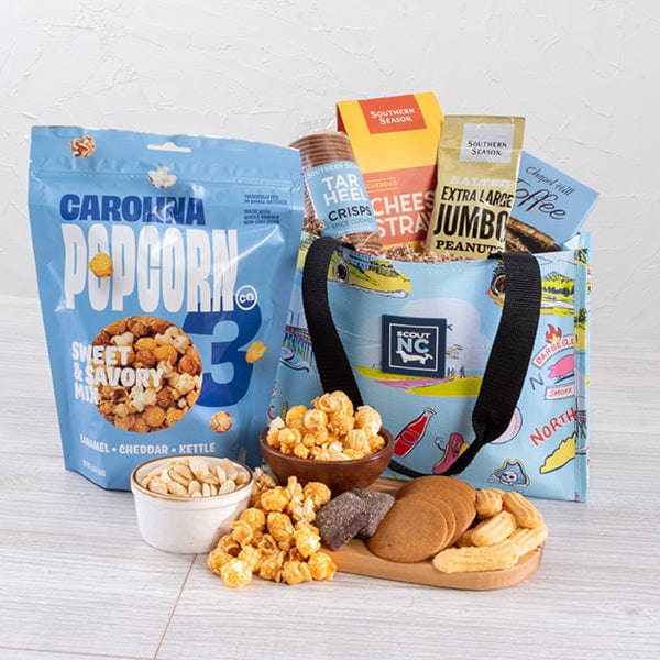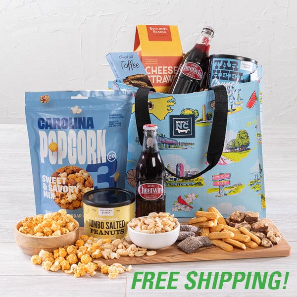Our Signature Tote - Small includes Chapel Hill Toffee, Cheddar Cheese Straws, Jumbo Salted Peanuts, Chocolate Dipped Fruit, and Tar Heel Crisps, making it the perfect gift for any occasion!
