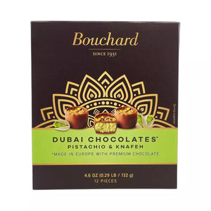 Made in Europe and inspired by Knafeh, the traditional Middle Eastern dessert, Bouchard bite-sized Dubai Chocolates combine smooth pistachio cream with crunchy Knafeh, all enrobed in rich European chocolate. Each bite brings the magic of the Middle East to your palate, offering a perfect balance of tradition and exotic flavors. There are 12 bite-sized pieces of chocolate per box. Comes in a classy gift box, making it an ideal gift for the holidays. Bouchard Belgian chocolatier has been a family-owned confectionery in the historic city of Ghent, Belgium, since 1931. Made in Germany for Bouchard.