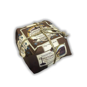 Panettone filled with chocolate cream, covered with dark chocolate and decorated with chocolate flakes. Hand-wrapped. The Panettone Chiostro di Saronno is produced according to the traditional recipe and criteria, through a slow and natural leavening and all ingredients, from flour to milk, eggs to butter, candied fruit to yeast, are of natural origin strictly fresh and genuine.