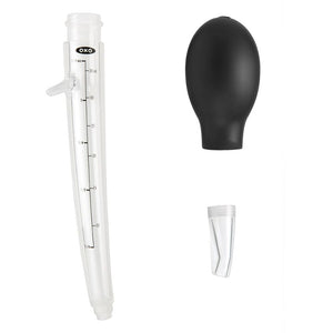 Thanks to its angled tip that easily draws in basting juices, this Baster can get into pans and ovens without putting your hands too close to the heat. The round silicone bulb is comfortable to squeeze from any angle, and the measurement markings are easy to read. An integrated stand keeps it from rolling around on the counter.